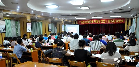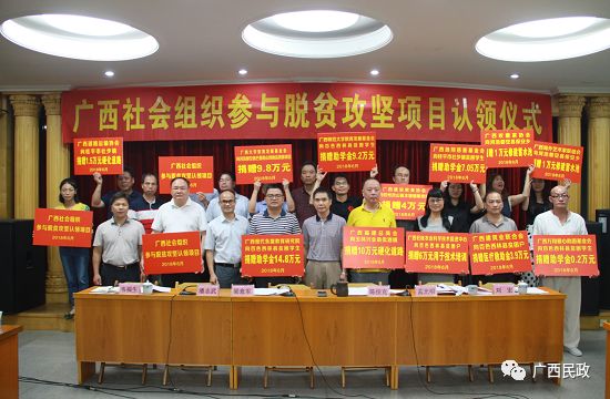 6月11日,自治区民政厅召开2018年广西社会组织参与脱贫攻坚工作推进座谈会,并举行社会组织参与脱贫攻坚项目认领仪式,推动了社会组织资源供给和扶贫需求的有效对接。