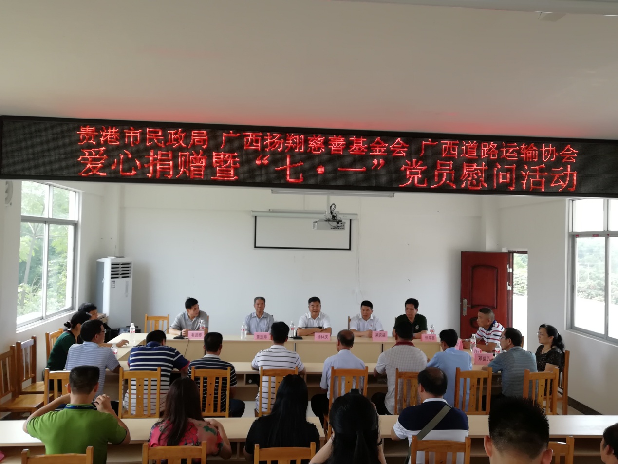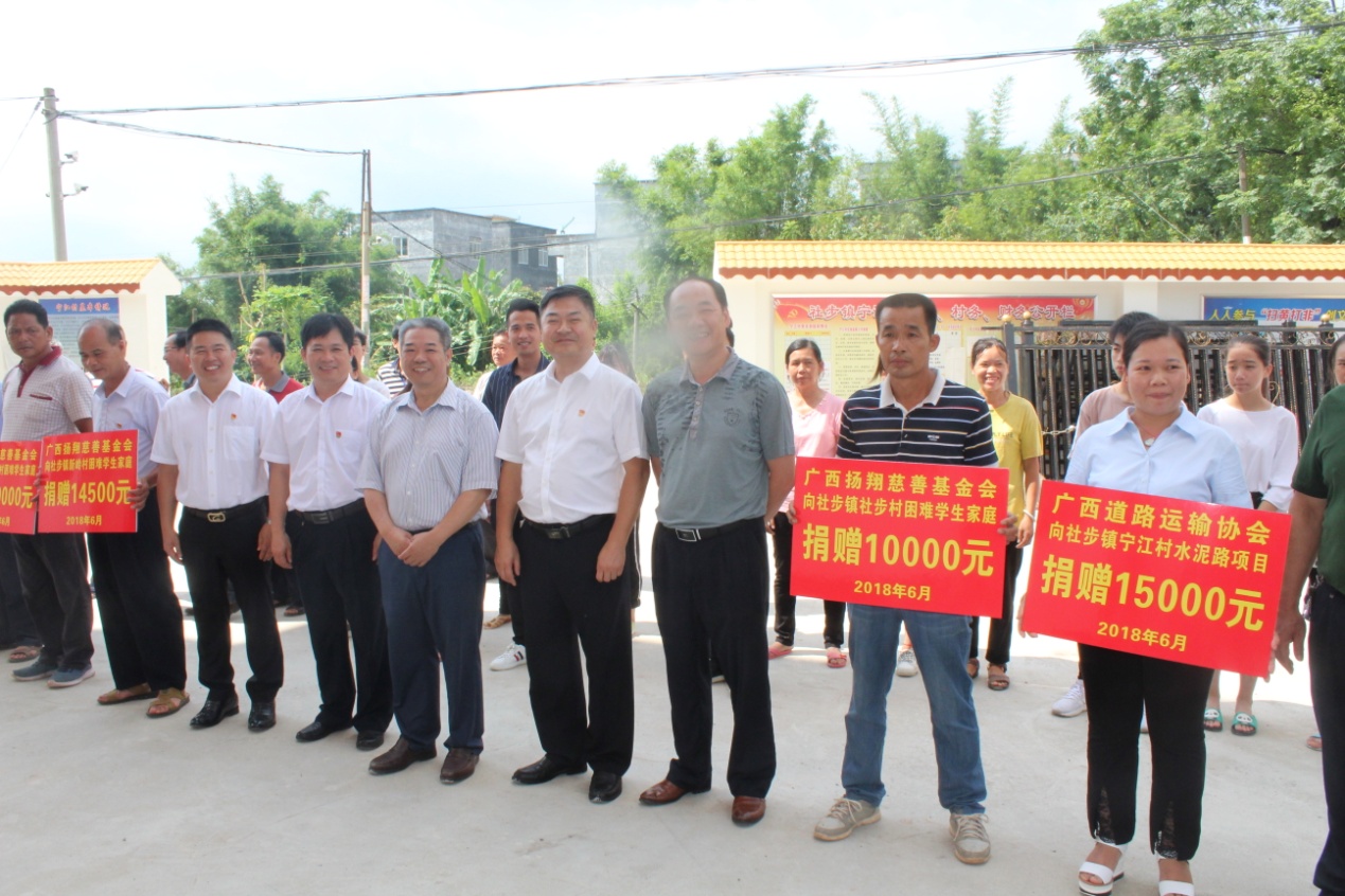 六月的宁江,正值初夏,万木葱茏,百花盛开。6月27日,在全国上下纪念中国共产党成立97周年之际,贵港市民政局、广西扬翔慈善基金会、广西道路运输协会在桂平市社步镇宁江村委隆重举行社会组织爱心捐赠暨“七·一”党员慰问活动,共商发展大计,共推脱贫攻坚。活动中,广西扬翔慈善基金会、广西道路运输协会为宁江村、社步村、良北村、新岭村等四个村的100多户贫困户130多名在读学生和宁江村米步屯水泥路项目捐助8.55万元。