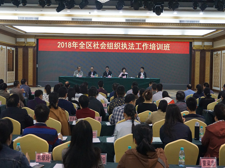 为进一步提升全区社会组织登记管理机关行政执法和社会组织信用信息管理水平,自治区民政厅于12月4日在南宁市举办2018年全区社会组织执法工作培训班。自治区民政厅党组成员、副厅长陈佳克出席开班仪式并作动员,民政部社会组织管理局执法二处处长刘宁宁为学员授课,各市、县(区)民政局分管领导及业务骨干共167人参加培训。