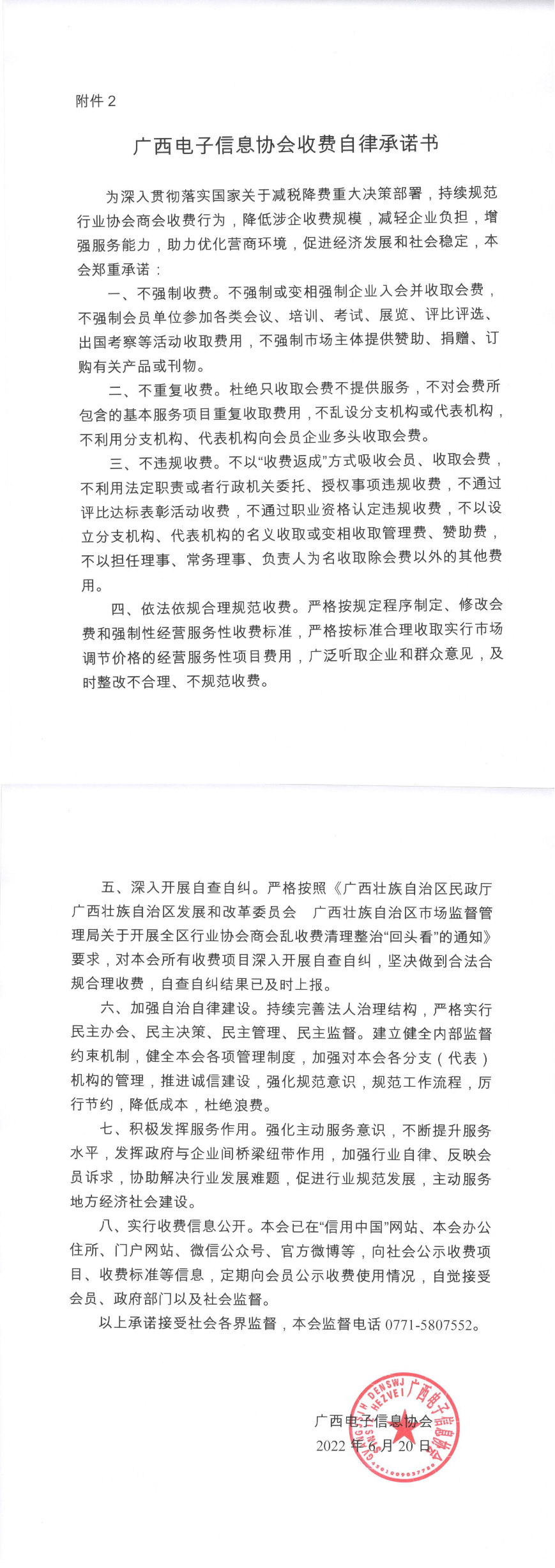 广西电子信息协会商会收费自律承诺书