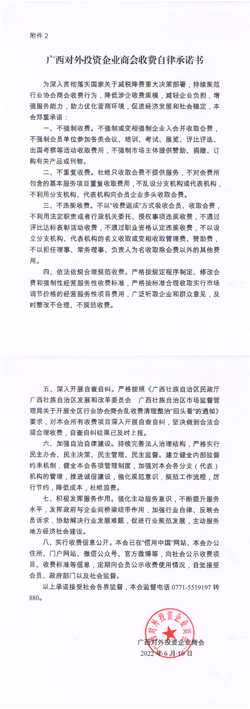 广西对外投资企业商会收费自律承诺书
