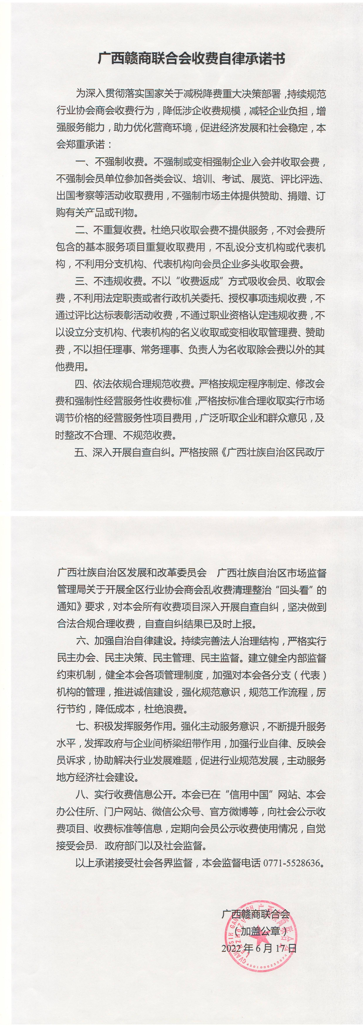 广西赣商联合会收费自律承诺书