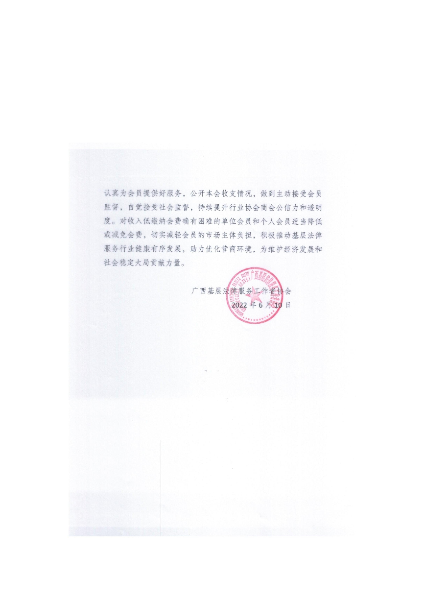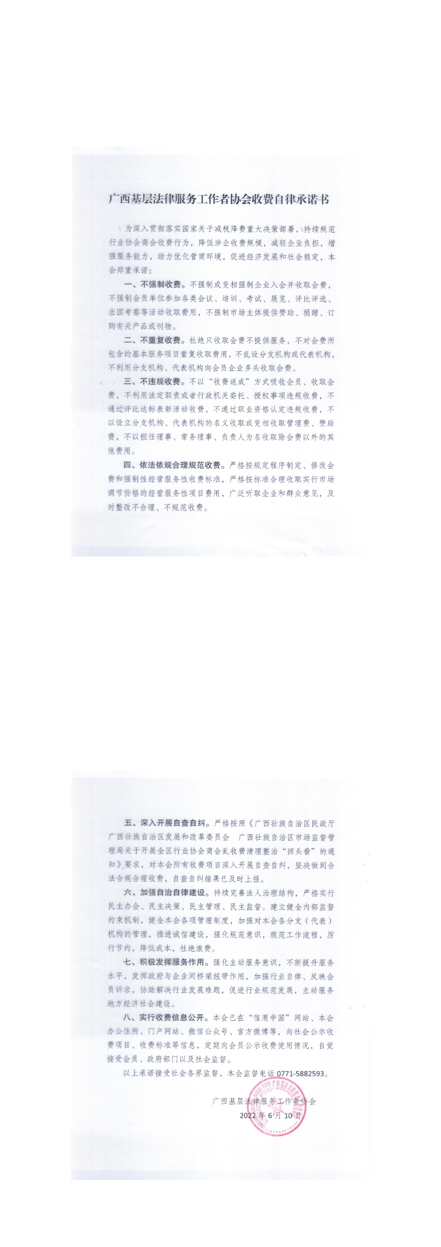广西基层法律服务工作者协会收费自律承诺书