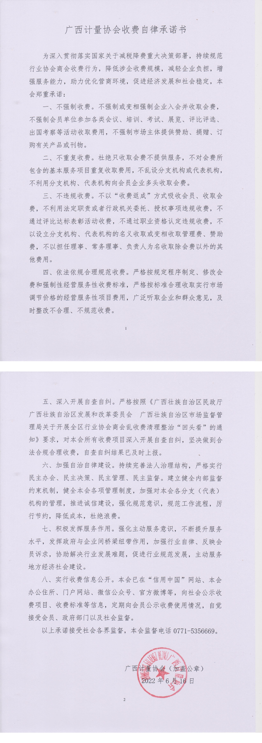 广西计量协会收费自律承诺书