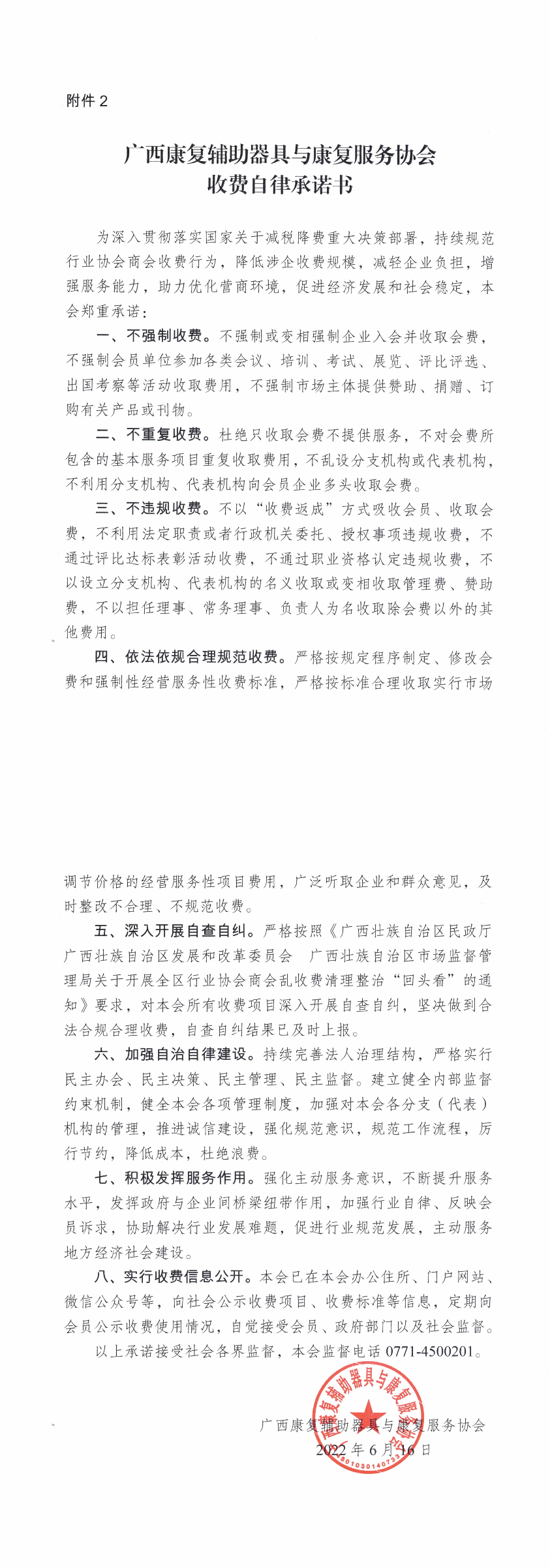 广西康复辅助器具与康复服务协会收费自律承诺书