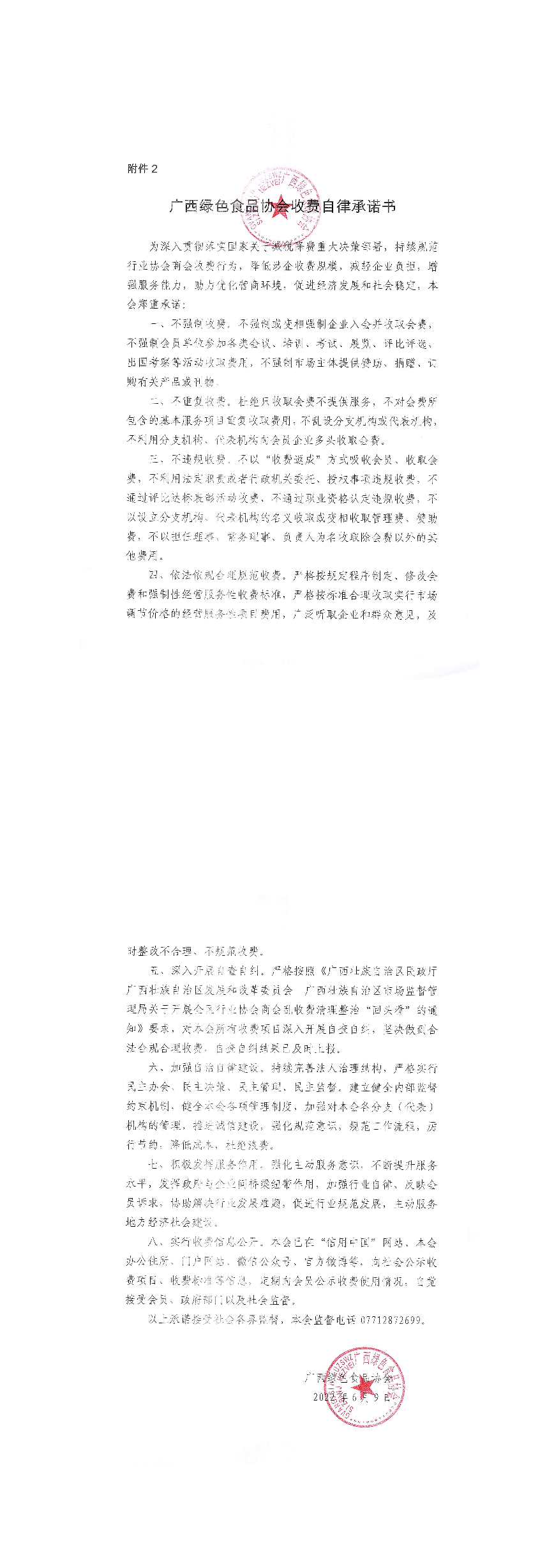 广西绿色食品协会收费自律承诺书