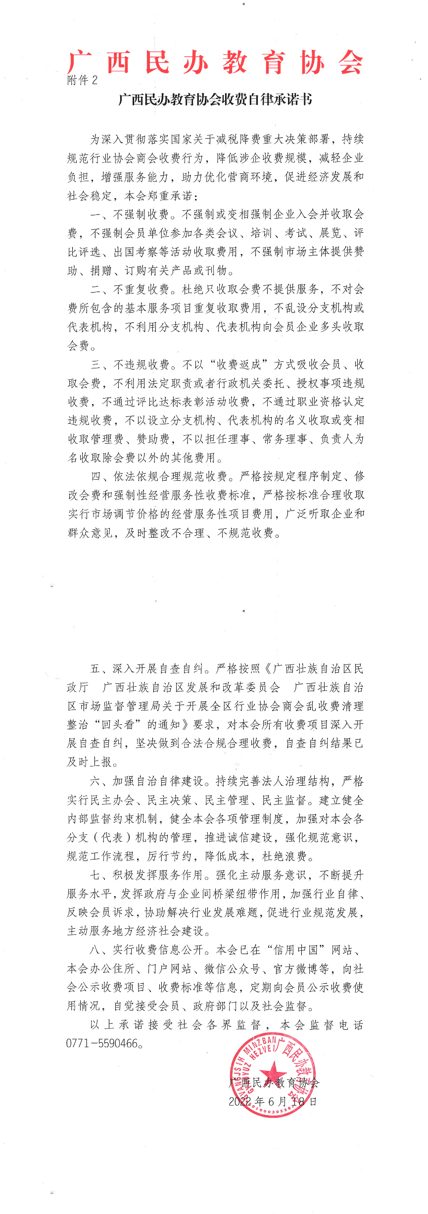 广西民办教育协会收费自律承诺书