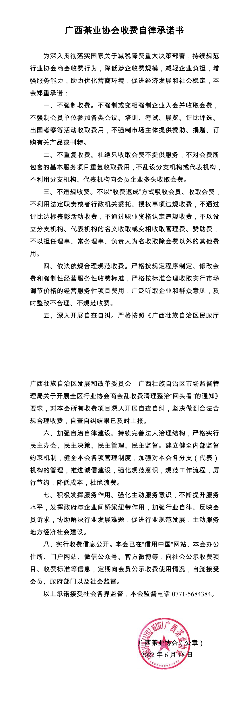 广西茶业协会收费自律承诺书