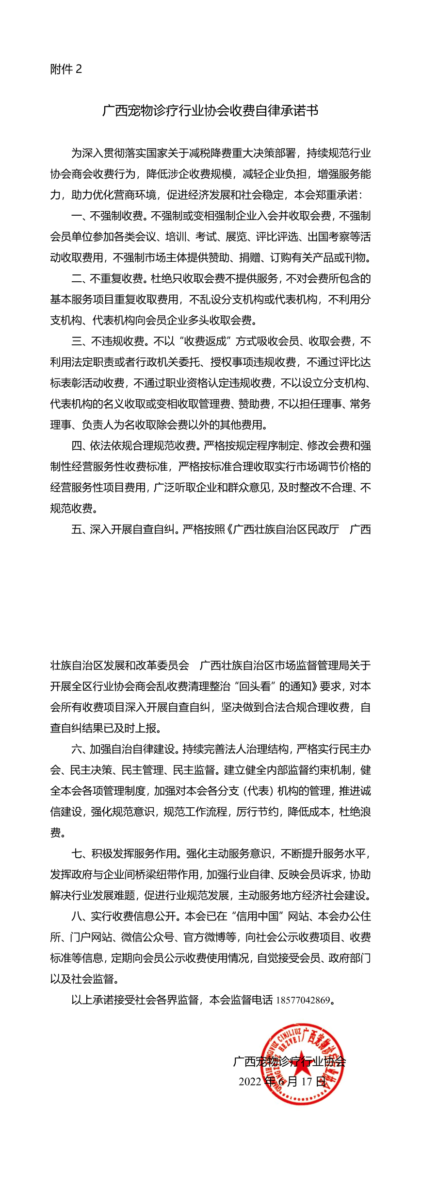 广西宠物诊疗行业协会收费自律承诺书