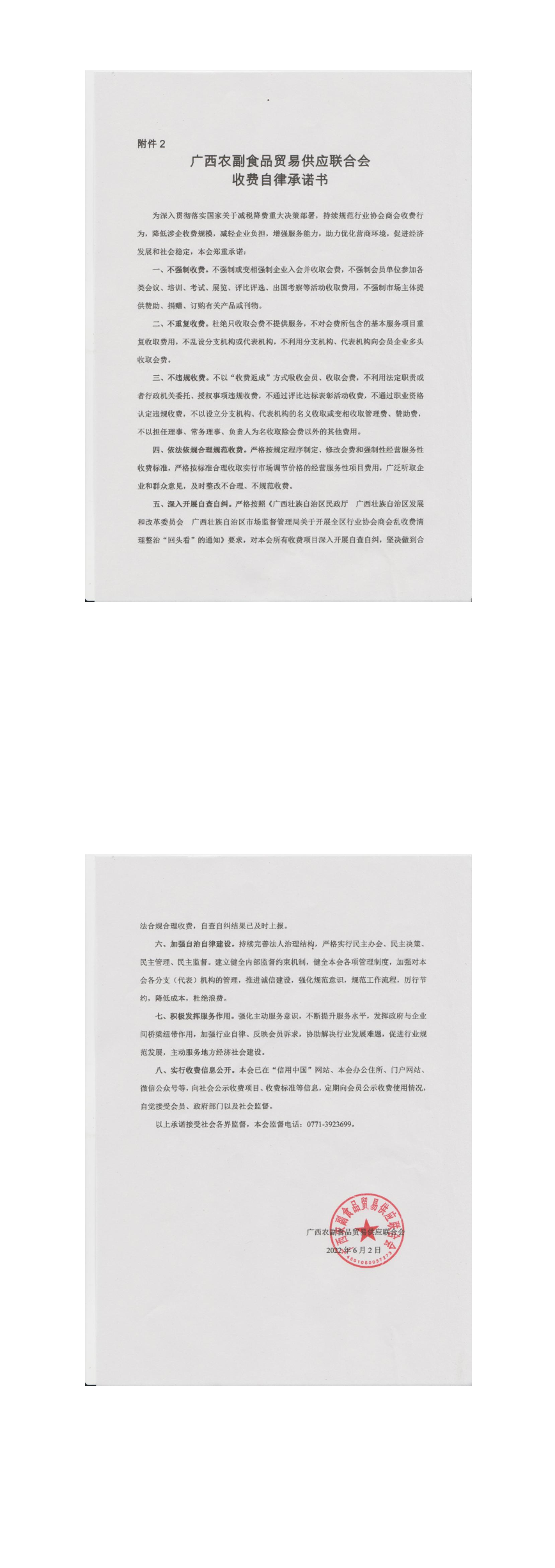 广西农副食品贸易供应联合会收费自律承诺书