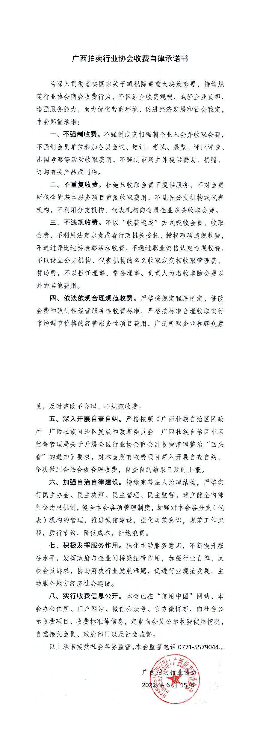 广西拍卖行业协会收费自律承诺书