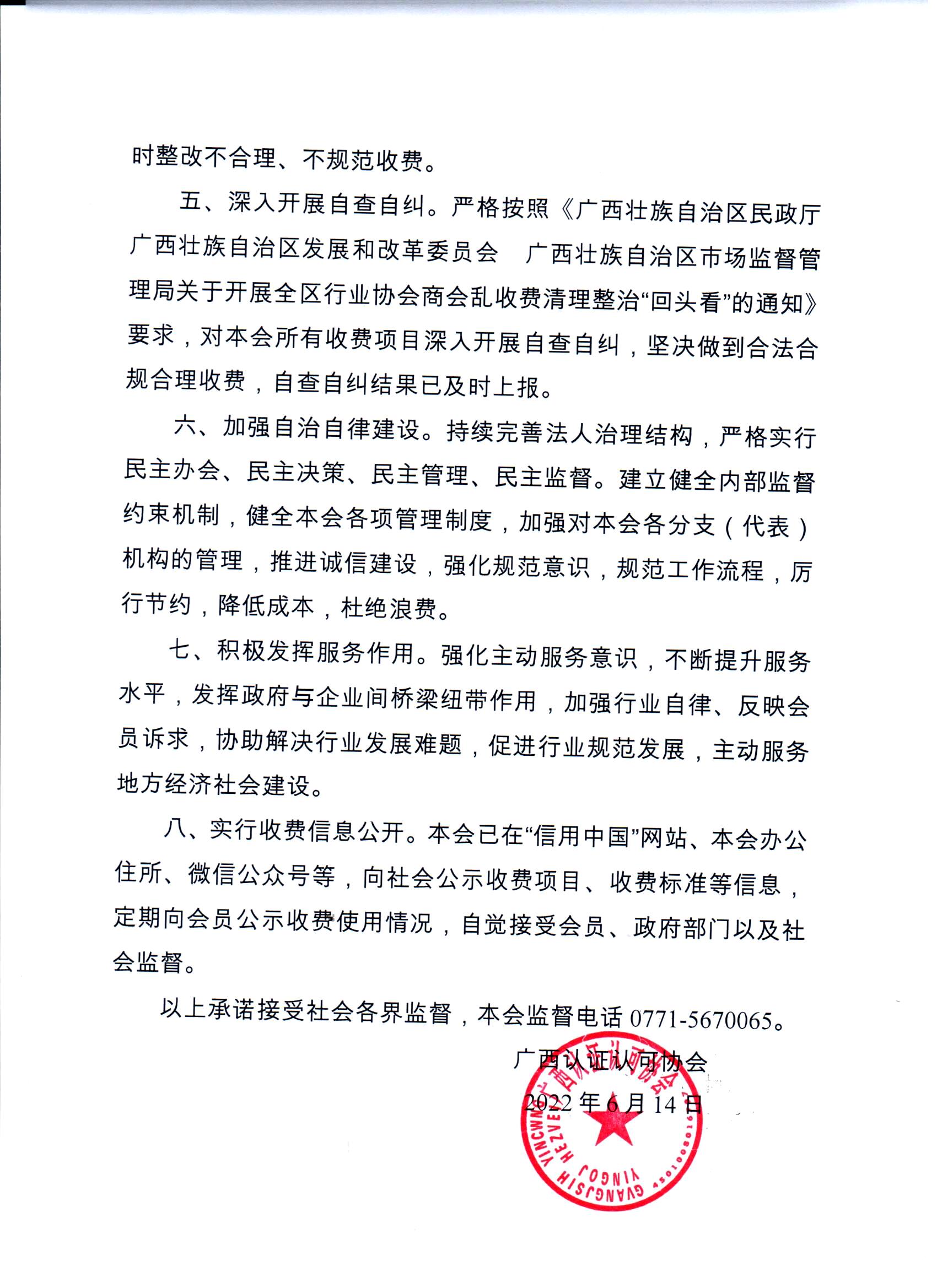 广西认证认可收费自律承诺书