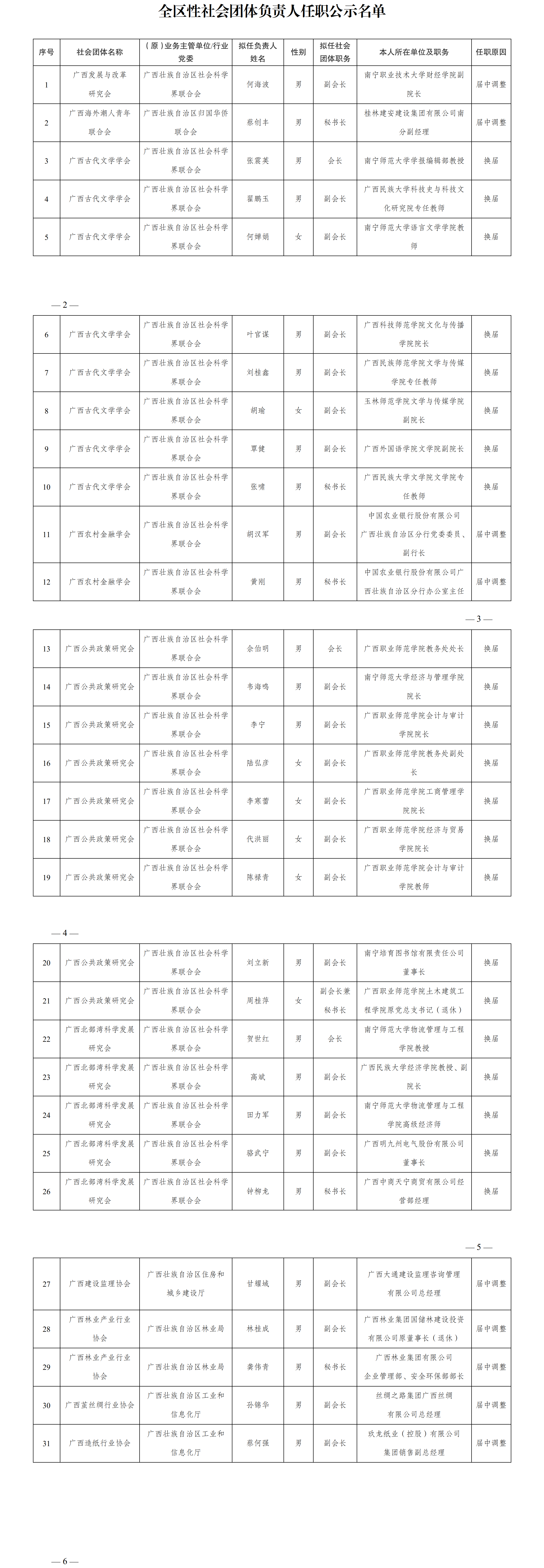 根据中共中央办公厅、国务院办公厅《关于改革社会组织管理制度促进社会组织健康有序发展的意见》和自治区党委办公厅、自治区政府办公厅《关于改革社会组织管理制度促进社会组织健康有序发展的实施意见》以及《广西壮族自治区社会团体换届指引》有关规定,根据社会组织申报,经我局审查,现将拟任相关社会团体负责人予以公示(名单见附件)。任何单位和个人如对公示的负责人名单有异议,可在公示期间,通过书面形式向自治区民政厅社会组织管理局、有关业务主管单位或行业党委举报和反映。