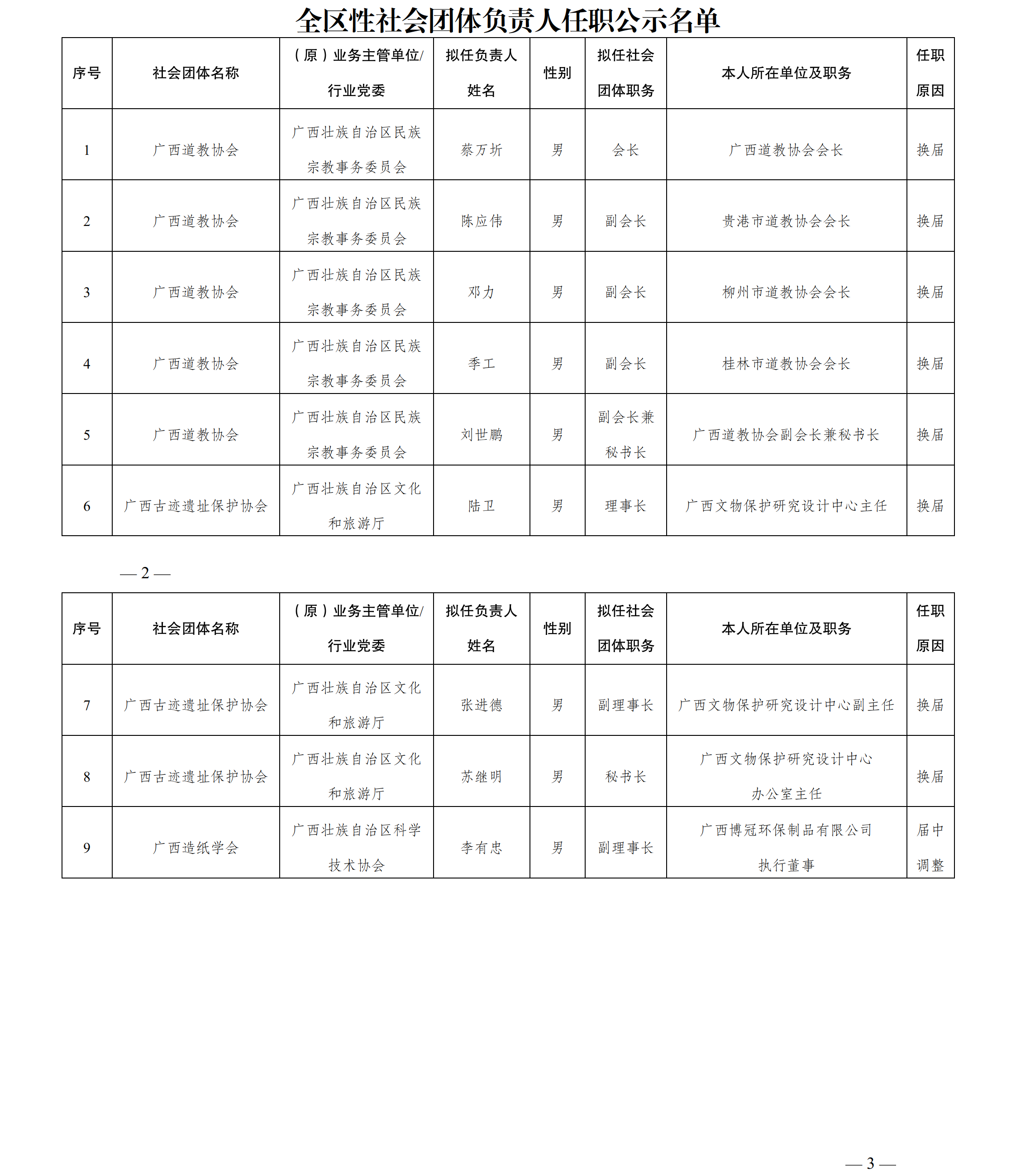 根据中共中央办公厅、国务院办公厅《关于改革社会组织管理制度促进社会组织健康有序发展的意见》和自治区党委办公厅、自治区政府办公厅《关于改革社会组织管理制度促进社会组织健康有序发展的实施意见》以及《广西壮族自治区社会团体换届指引》有关规定,根据社会组织申报,经我局审查,现将拟任相关社会团体负责人予以公示(名单见附件)。任何单位和个人如对公示的负责人名单有异议,可在公示期间,通过书面形式向自治区民政厅社会组织管理局、有关业务主管单位或行业党委举报和反映。