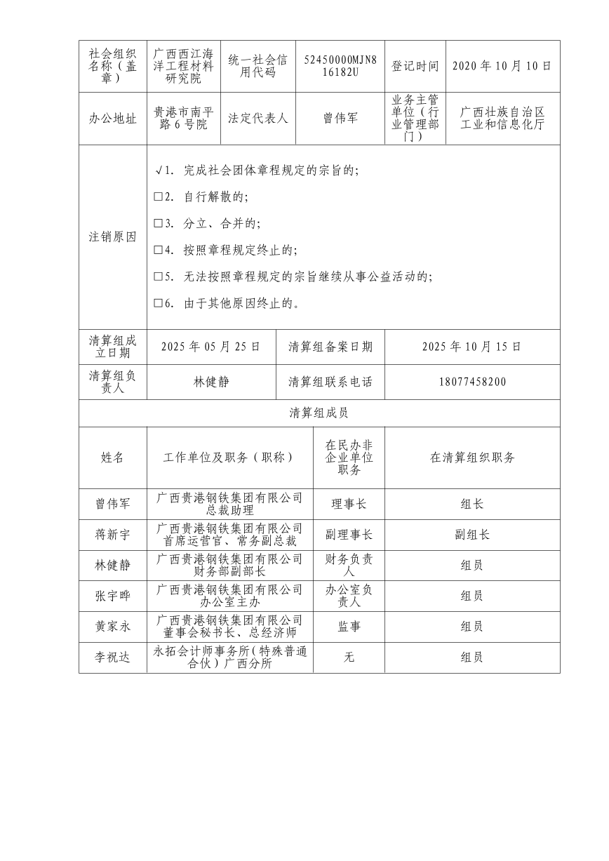 广西西江海洋工程材料研究院清算组公告